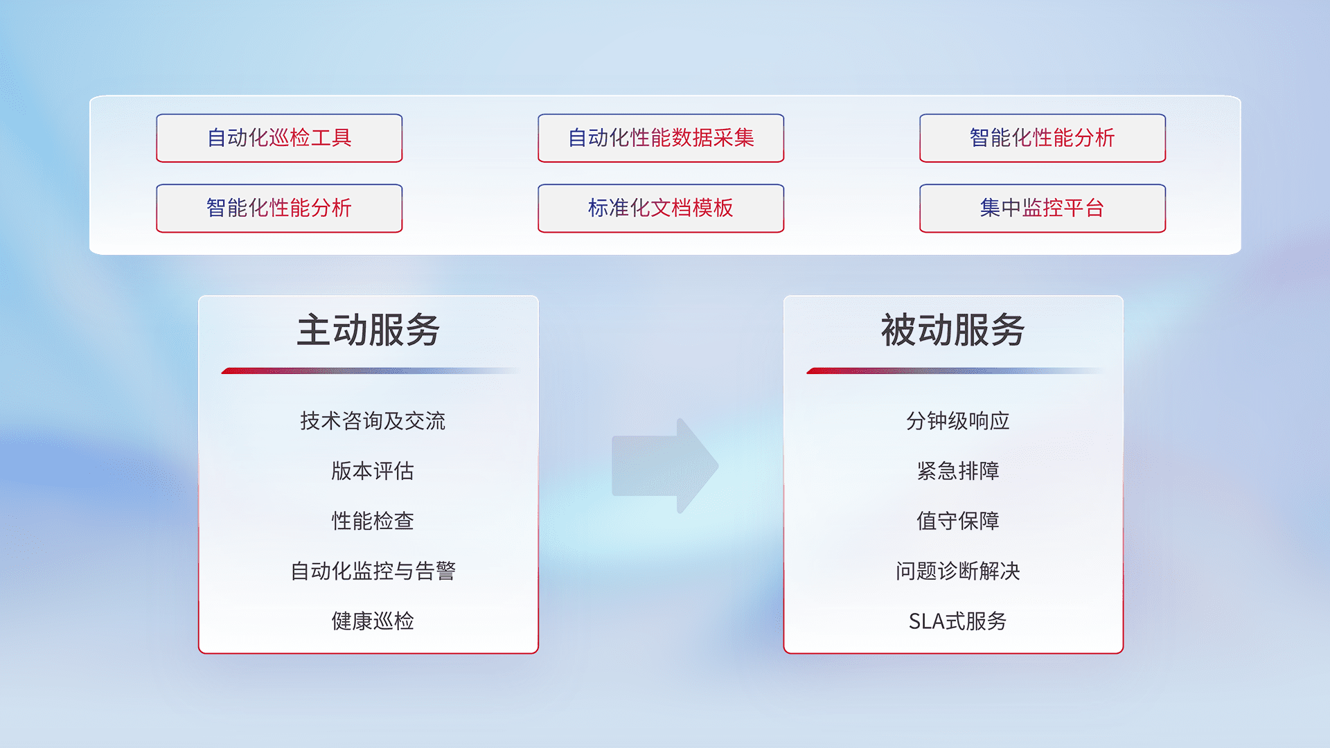智能化工具和标准化文档,,保障服务质量,,,,提供主动服务(包含技术咨询、、版本评估、、、、性能检查、、、自动化监控与告警、、、、健康巡检)和被动服务包含(分钟级响应、、紧急排障、、、、值守保障、、、、问题诊断解决、、、SLA服务)。。。